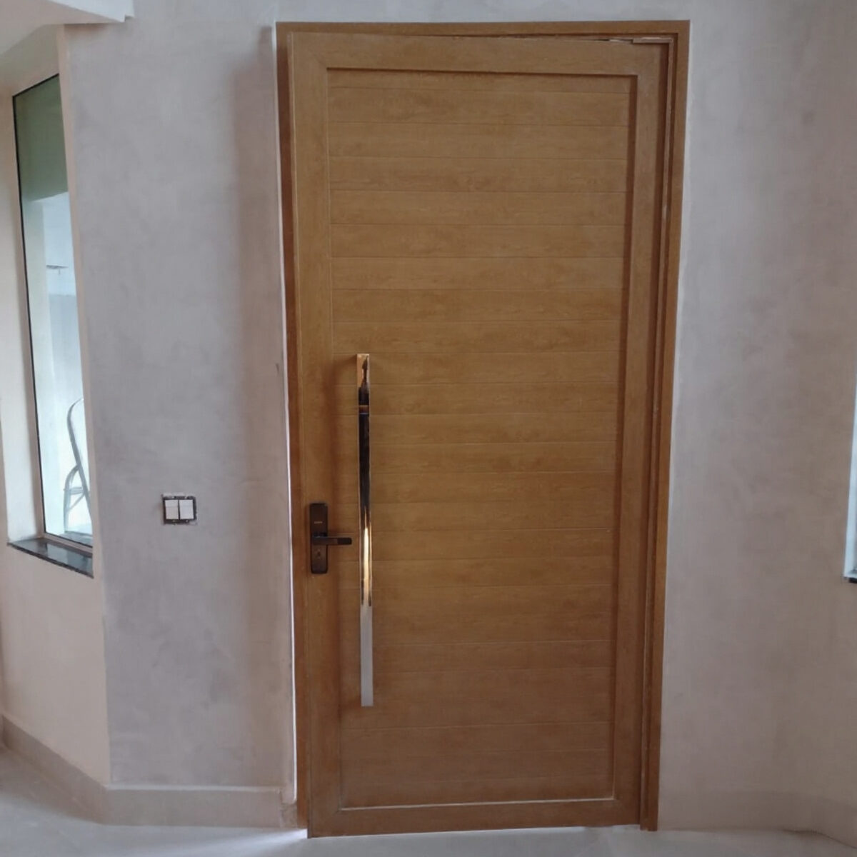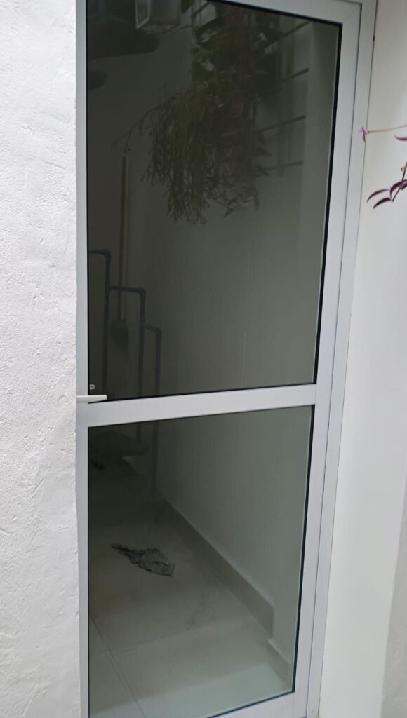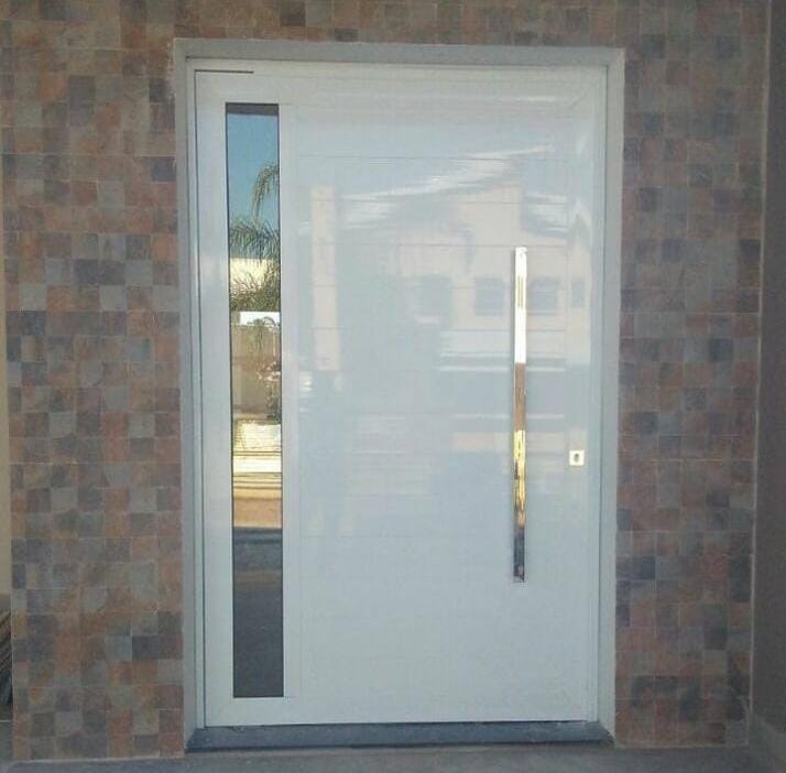 Porta de giro com travessa central, acabamento do perfil na cor branco brilhante RAL9003.