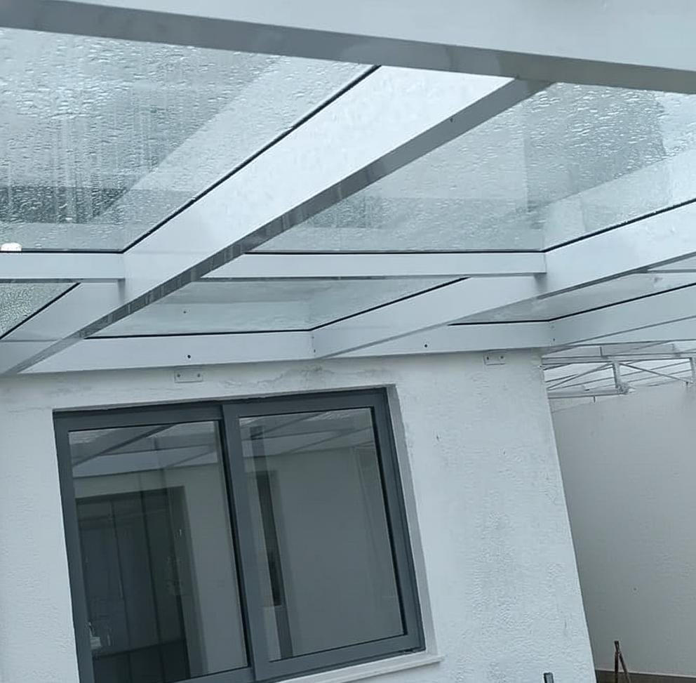 Cobertura fixa com vidro lâminado, acabamento do perfil branco brilhante RAL9003.